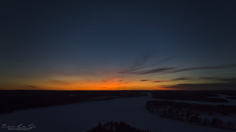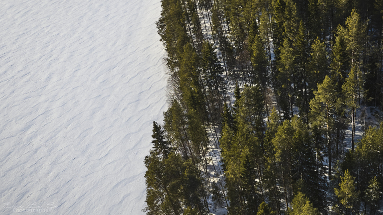 Le paysage est dominé par d'immenses forêts boréales de pins, d'épicéas et de bouleaux givrés. Les branches plient sous le poids du givre, dessinant des formes presque sculpturales. Les lacs innombrables de la région sont figés sous la glace, recouverts d'une surface blanche immaculée où la frontière entre terre et eau disparaît. À la tombée de la nuit, lorsque le ciel est clair, il n'est pas rare d'apercevoir les aurores boréales onduler lentement au-dessus des forêts sombres.